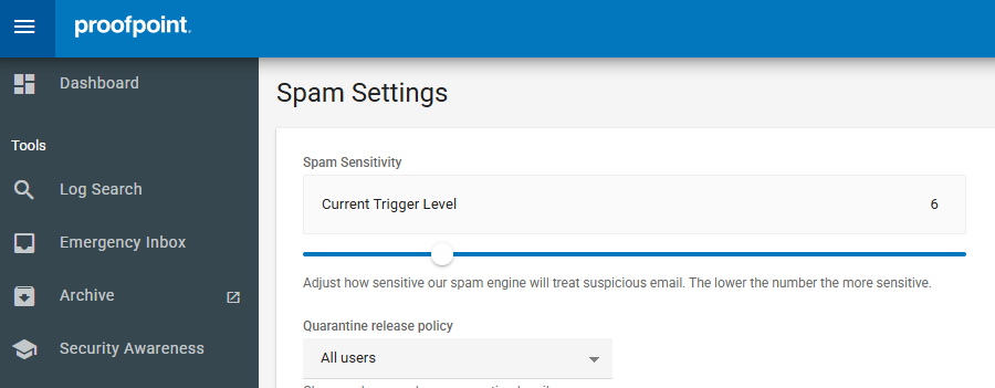 Proofpoint allows administrators to set the sensitivity of spam detection: