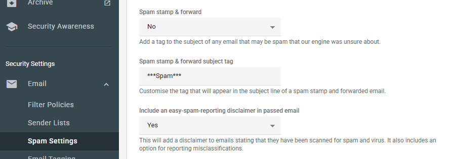 - Set the Spam stamp & forward subject tag to your preferred text (e.g., "***SPAM***").