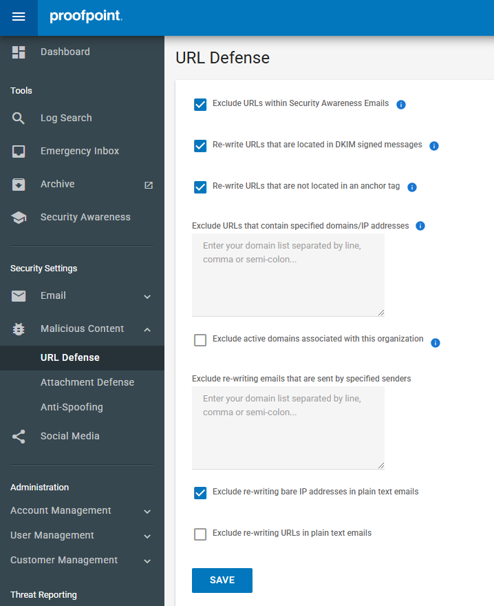 - Exclude URLs within Security Awareness Emails: This ensures that users interact with phishing simulations as intended, rather than being redirected through Proofpoint's security filter.